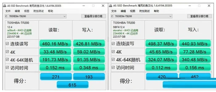 Benchmark跑分对比。可以看到两版在得分上的差距非常明显,其中“4K”与“4K-64K随机”是差别最大的两个选项。这两组选项所对应的,正是日常工作中大量的小体积零碎文件读写。
