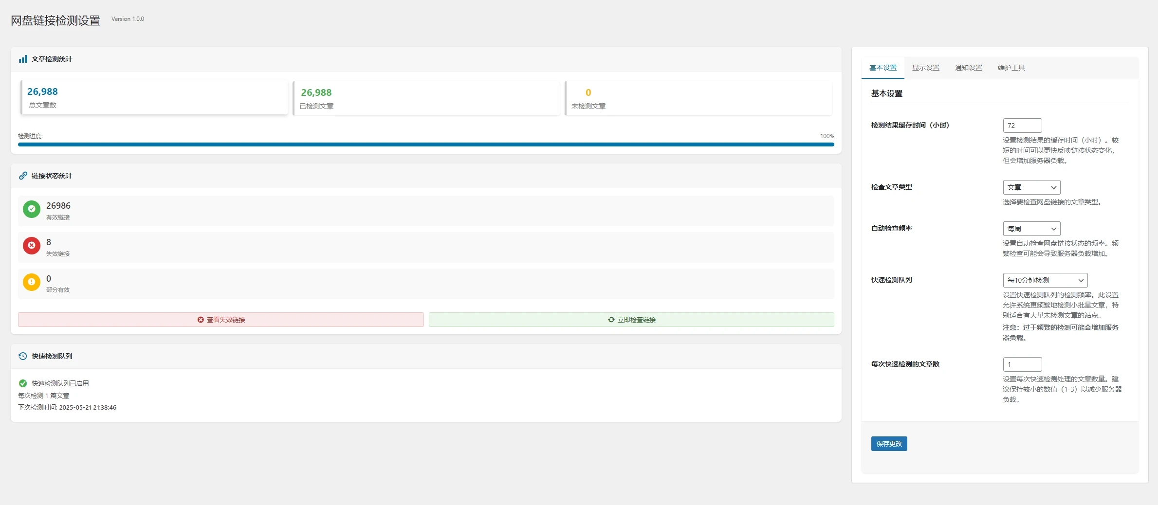 激活插件后,系统会自动开始检测文章中的网盘链接