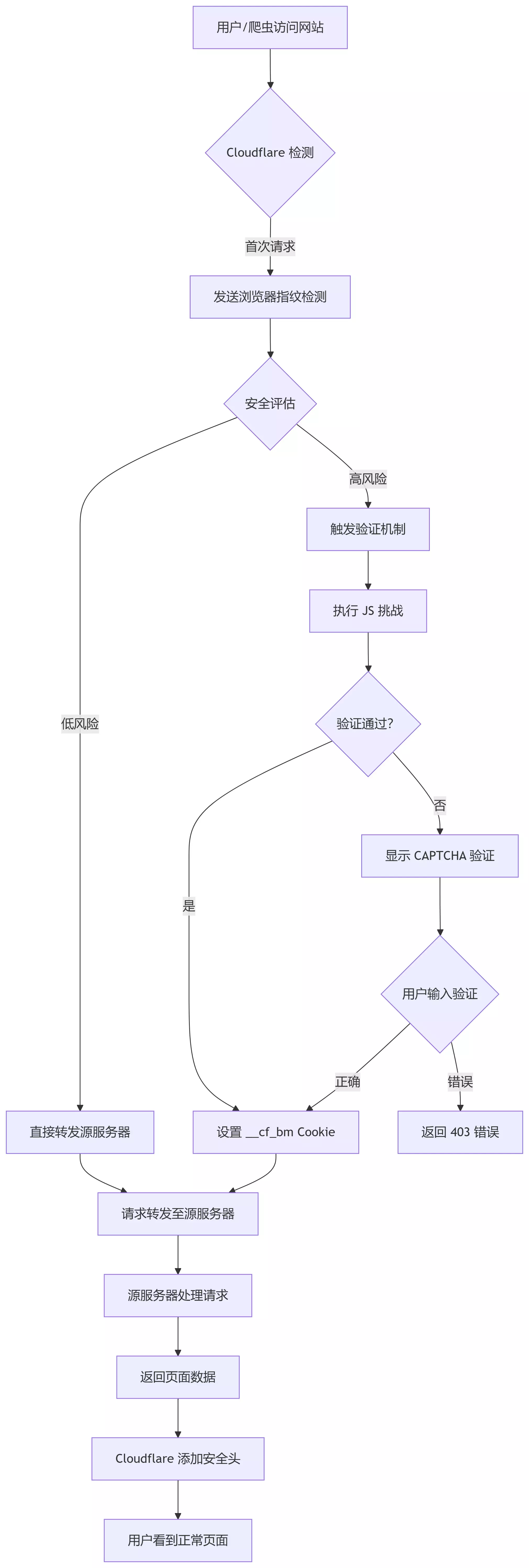 一旦Cloudflare检测到可疑的机器人活动,就会发起后台JavaScript挑战;如果无法通过该挑战,就会要求用户输入CAPTCHA验证码。