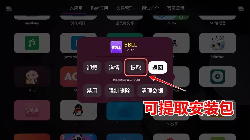 支持管理电视上应用的卸载、禁用、清理缓存数据等功能;还支持提取已安装应用的安装包,这个功能非常好,方便小白用户提取自己电视上或者车机上比较好用的APP。