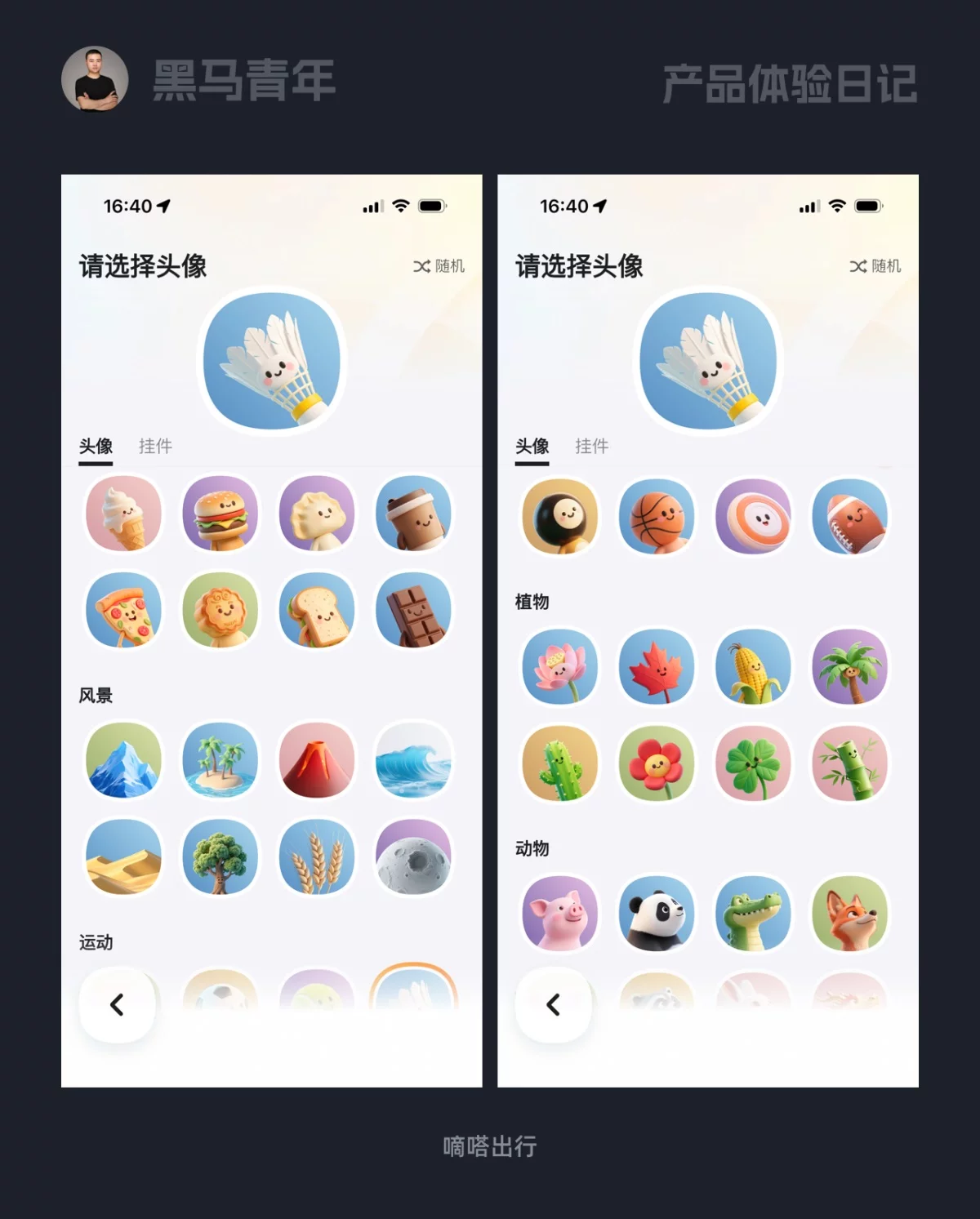 嘀嗒出行 App 在个人中心头像设置中,为用户提供了风景、食物、运动、动物、植物等多种选择,用户可以自由设置,也可以采用随机选择。不仅利用丰富多样的头像预设满足用户喜好,头像的设计也非常有创意,值得体验学习。