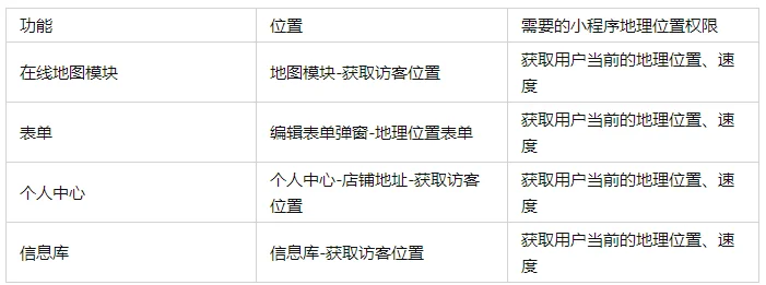 近期,微信官方针对小程序的地理位置权限接口规范进行了相关调整,涉及以下功能(如下图)的微信小程序,均需完成地理位置权限申请才能提审发布。那么小程序开发的地理位置权限如何开通呢?