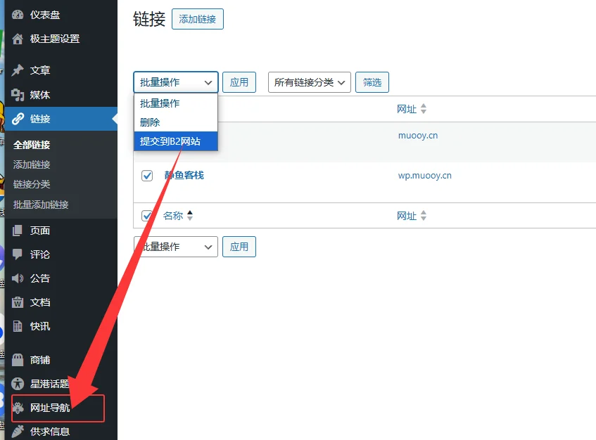 B2主题美化:老用户都了解,B2主题有自带的网址导航界面 links,但是该界面的链接需要自行添加,跟WordPress自带的链接功能是不兼容的,不能自动读取自带的链接。便想直接在链接页面添加一个“提交到B2主题网站”的功能,大家可自由选择需要提交的已有链接,便可自动转到B2的网址导航中。