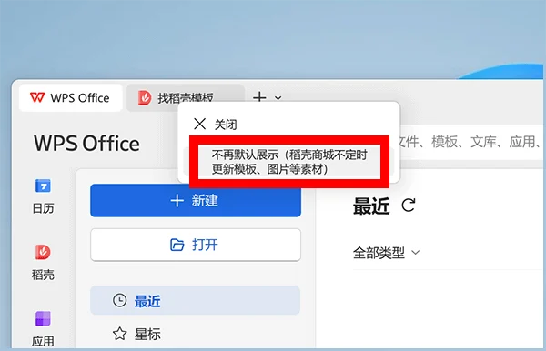 首先打开WPS,顶栏有个“找稻壳模版”每次启动都会弹出来,是不是感觉很烦人?其实你只要右键点它,选择“不再默认展示”,就可以永久关闭它。然后点右上角“全局设置”按钮,进入设置,打开备份中心。