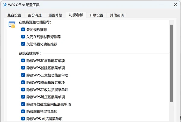 点“高级”,在兼容设置页面,可以恢复被篡改的文件打开方式。取消勾选,你不想用WPS打开的文件格式,比如图片、OFD、OPG等。“默认应用保护”记得也要取消打勾,然后点顶部栏,进“功能定制”页面。