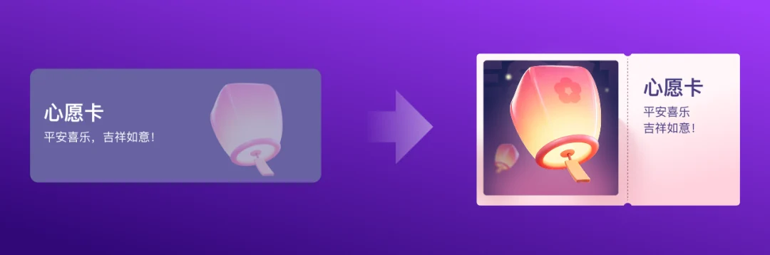 既然是心愿“卡”,我们可以将其设计成分主副的卡券样式,将孔明灯置于卡券左侧进一步凸显主体,将文字置于右侧: