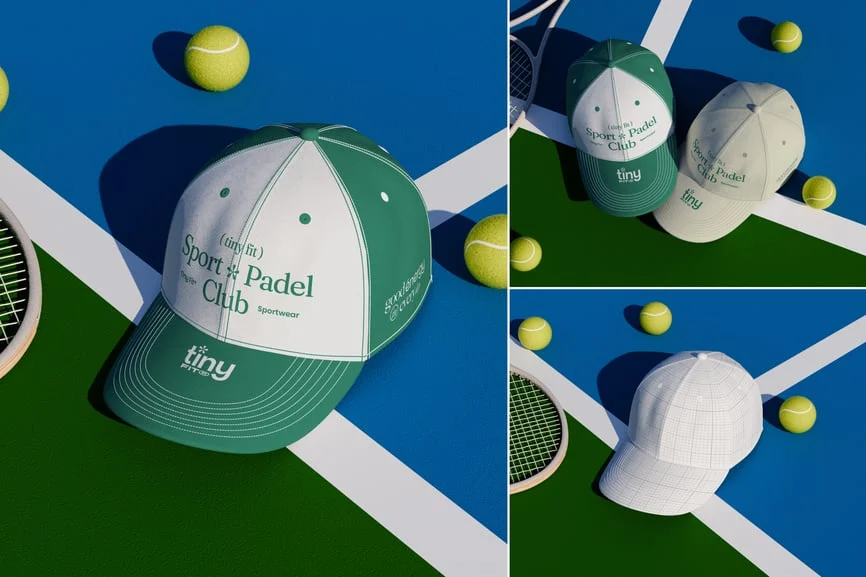 这款**逼真的棒球帽样机**采用**俯视高角度拍摄**,背景是**充满活力的蓝绿色网球场**,完美展现您的帽子。清晰的白色线条、散落的球拍和网球营造出真实的运动氛围——非常适合运动品牌、俱乐部周边产品或以球场为主题的生活方式宣传活动。