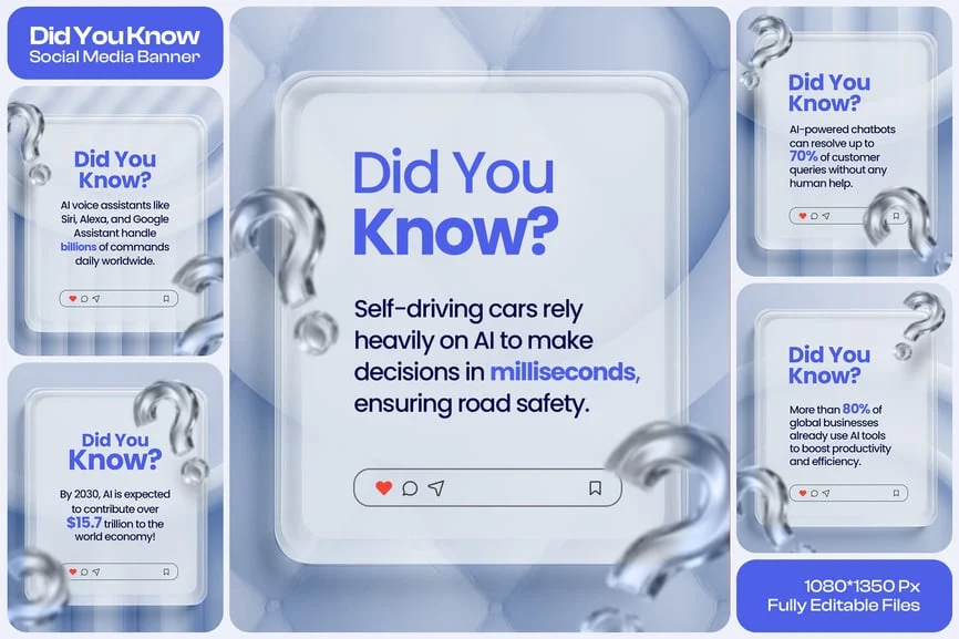 **隆重推出我们的“你知道吗”Instagram社交媒体帖子设计模板套装——一款简洁现代的模板,旨在让您的信息丰富、引人入胜的帖子脱颖而出。该设计采用时尚的液态玻璃效果,搭配流畅的渐变和优雅的字体,非常适合在Instagram、Facebook和其他平台上分享趣味知识、品牌秘诀或教育内容。模板完全可编辑,易于自定义,您可以调整颜色、文本和图像,以契合您的品牌视觉形象。**