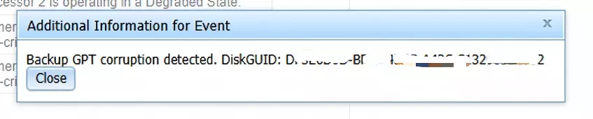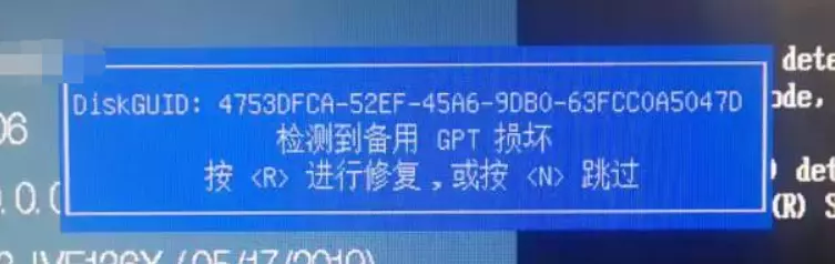 最近有一台System x3650 M5服务器硬盘故障,硬盘做的是单盘RAID0,按照维护流程关机更换硬盘和重做单盘RAID0,然后开机进入系统POST期间提示“backup GPT corruption detected”(如下,忘记截图,网上图片),同时IMM或者XCC也会有相应的Warning级别告警提示:Backup GPT corruption detected. DiskGUID: XXXXXXXX-XXXX-XXXX-XXXXXXXXXXXX。
