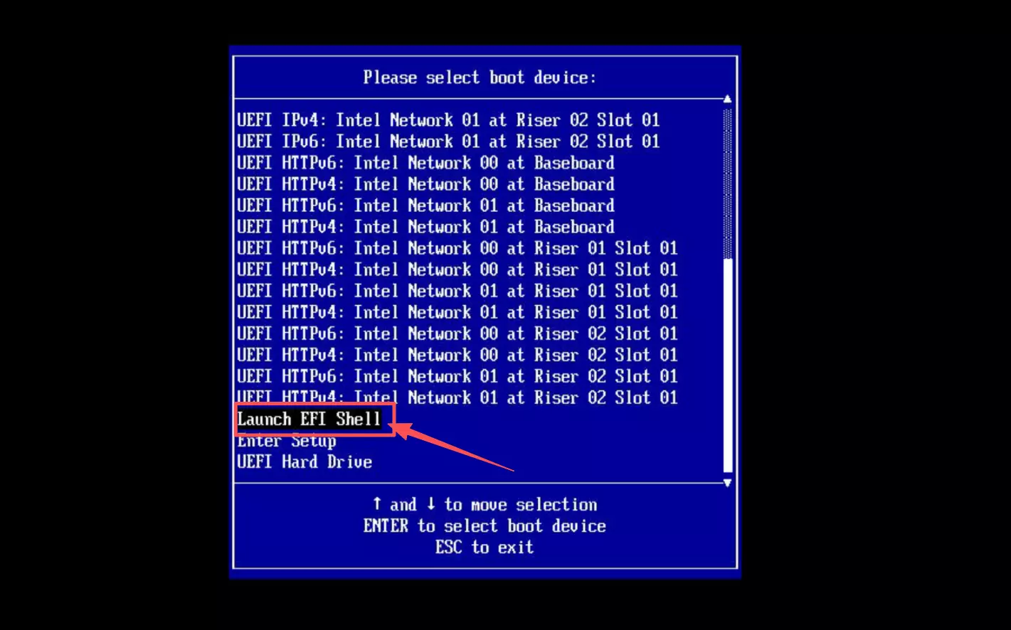 将服务器接通电源,插入已拷贝固件的U盘、键盘和显示器,启动服务器。在开机自检(POST)阶段,当屏幕出现联想ThinkSystem 品牌标识或启动画面时,迅速按下键盘“F6”键,进入引导启动选项界面。在引导启动界面中,通过键盘上下箭头键选择“Launch EFI Shell”选项,按下回车键进入EFI Shell操作界面。