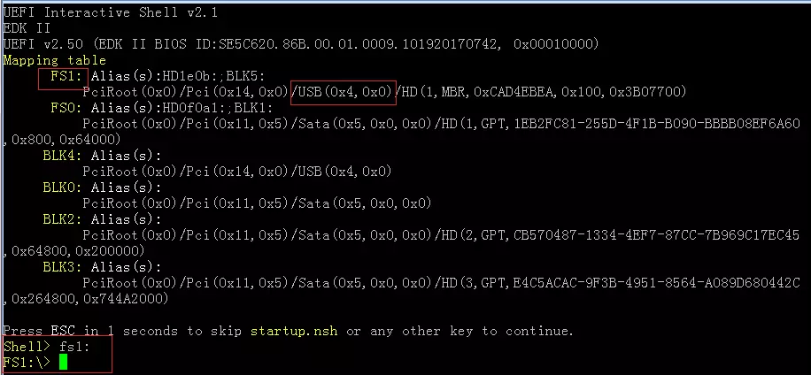 EFI Shell界面会显示系统识别到的存储设备映射表(Mapping table),U盘对应的盘符通常为“FS0:”(可通过设备容量或类型判断)。在命令行中输入FS0:(注意冒号为英文半角,不可省略),按下回车键切换至U盘根目录。