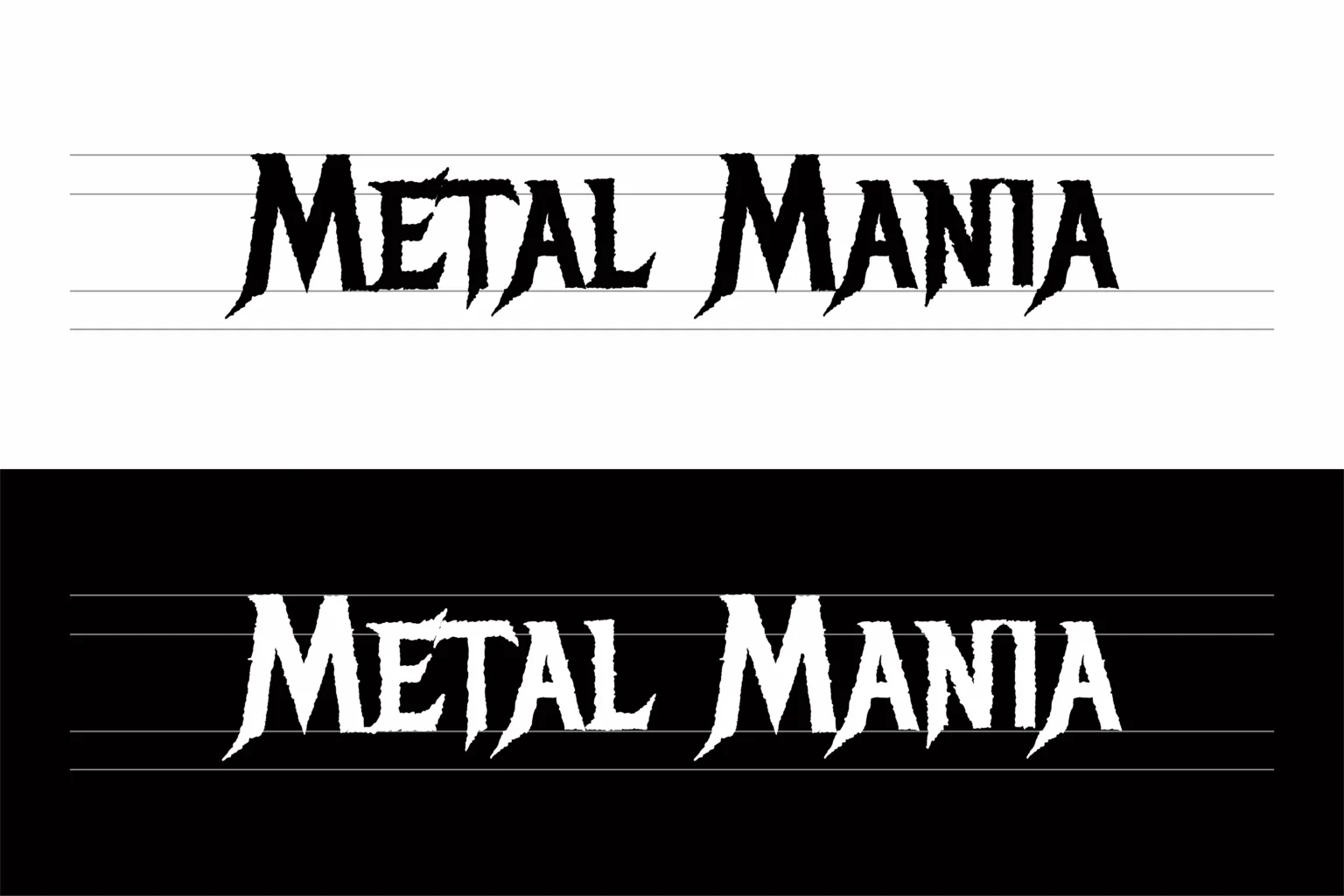 如图1所示,在极致的黑白正反色对比中,“METAL MANIA”一词以原始、强烈的视觉宣言定义了自身。字体笔画粗壮且充满手工绘制的不规则感,边缘并非光滑的几何线条,而是呈现出类似手工撕裂、凿刻或喷漆覆盖般的粗粝质感。独特的是“裁切”效果,字母内部形成的镂空负形线条(在“M”、“E”、“A”等字母中清晰可见),这模拟了粗糙模板或手工切割的效果,为字体注入了强烈的地下文化、DIY手作与不羁的个性,完美契合了重金属音乐的视觉内核。