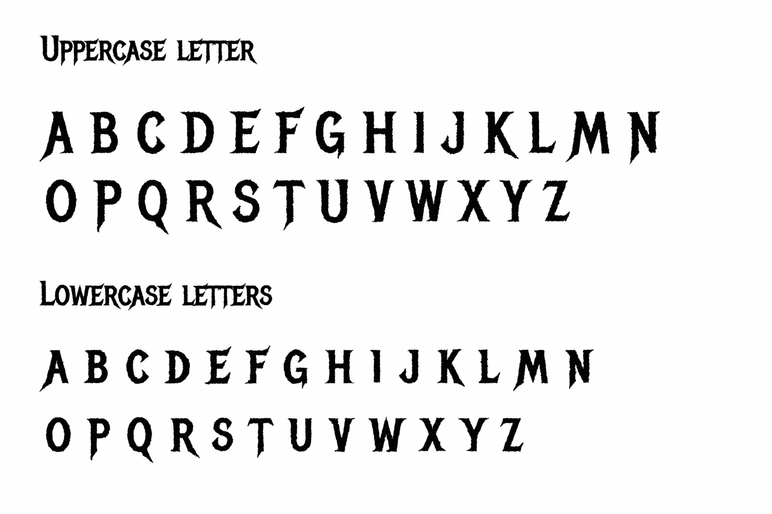 图2的完整字母表。所有大写与小写字母都严格遵循一套统一的破坏性美学语言。笔画末端多为尖锐、不规则的切割状,转折处充满张力。尽管每个字母都显得狂放不羁,但它们在笔画重量、倾斜角度与整体视觉密度上达到了高度统一。这种统一确保了当它们排列在一起时,能形成一个协调、有力且风格极其鲜明的视觉整体,而非真正的杂乱无章。