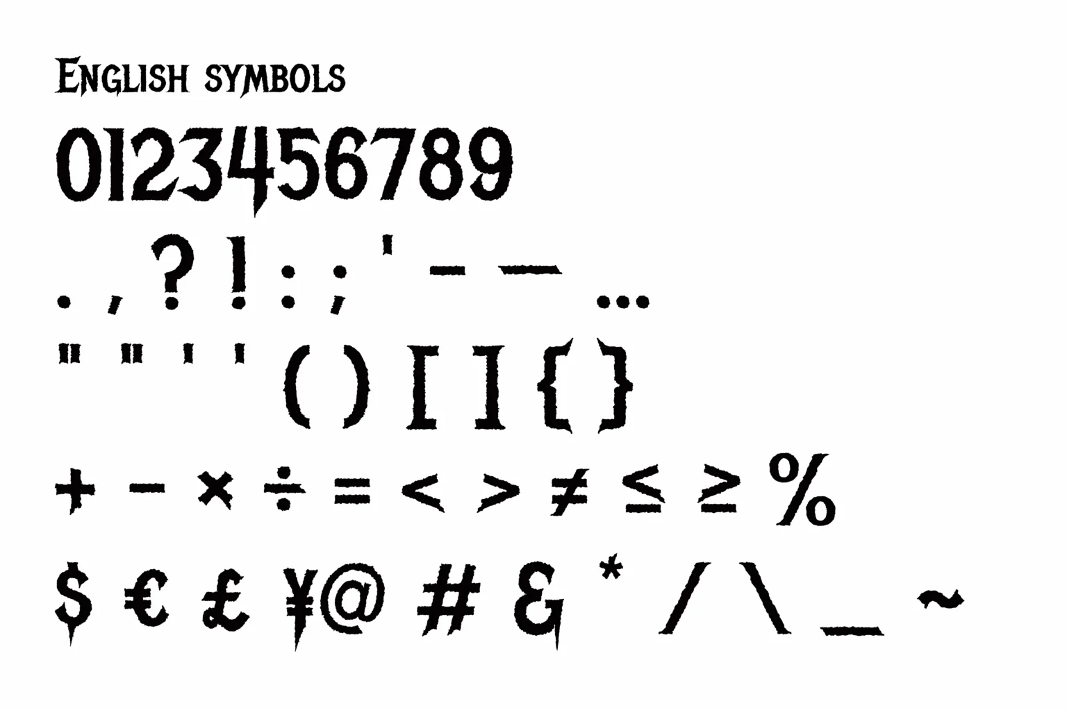 图3所展示的庞大英文符号集,是Metal Mania作为一款可投入真实设计项目的专业资产的证明。从数字、标点、数学符号到货币符号($, €, £, ¥)及各类特殊符号,无一例外地被“金属化”了。所有符号都继承了主体字母的粗粝笔触、尖锐转角与裁切效果。这意味着设计师在创作音乐会海报、专辑封面、乐队Logo、周边商品时,从主标题、演出日期、价格到歌词引言,全部视觉元素都能沉浸在同一套狂暴、统一的视觉语言中,打造出百分百纯正的金属氛围。