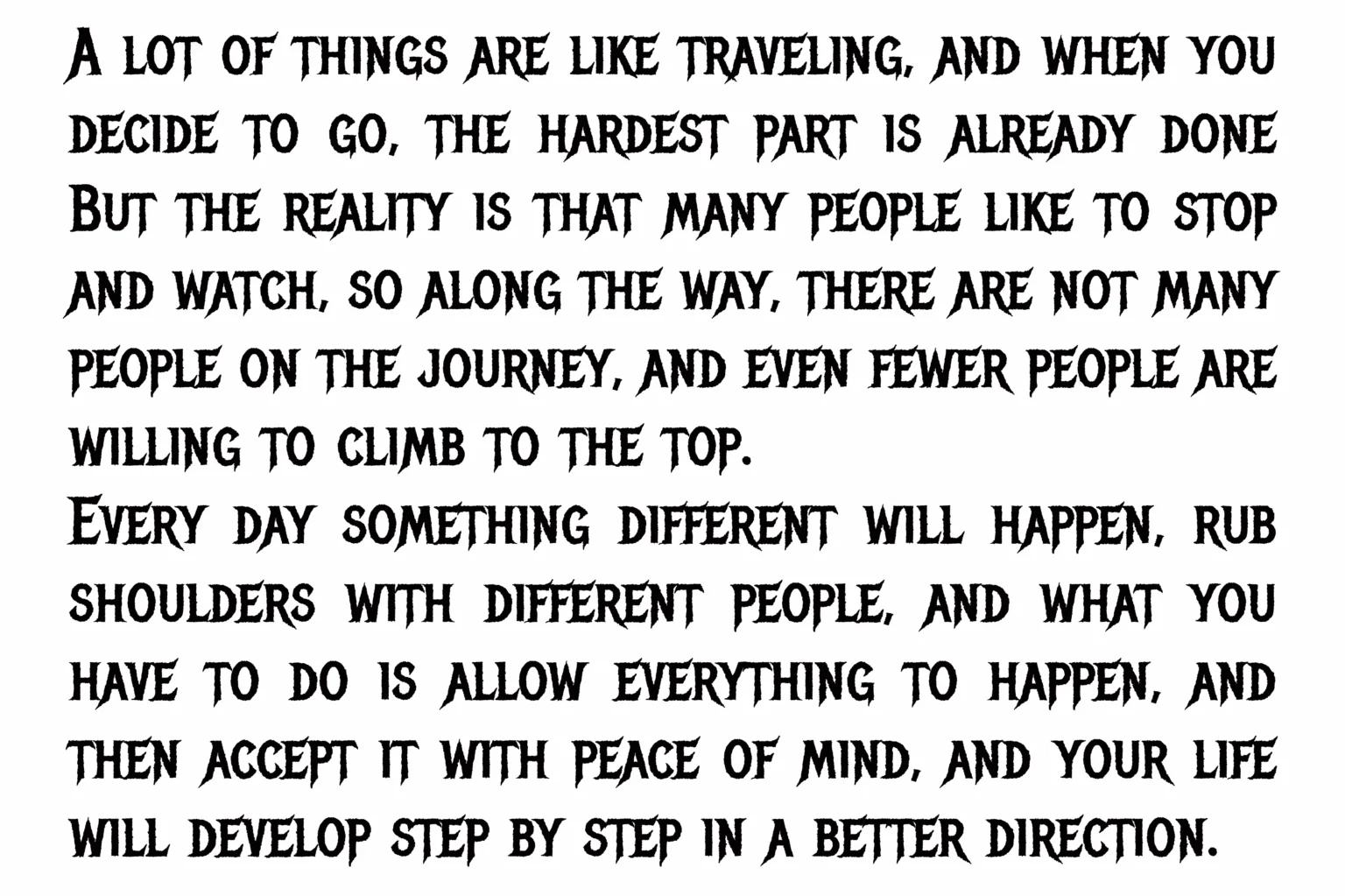 图4的段落排版令人惊讶地展示了承载长篇文本的能力。在这段关于勇气与坚持的哲思文本中,Metal Mania 将阅读体验转化为一种铿锵有力、充满信念感的宣言。粗壮的笔画和紧凑的字间距,使文本块成为一块坚实、浓密、极具压迫感的视觉磐石。尽管风格极端,但由于字形结构清晰,可读性得以保留。阅读时,文字散发出一种不屈、坚定甚至略带攻击性的语气,完美地将形式与内容结合,非常适合用于乐队理念陈述、专辑内页说明或任何需要传递强大精神力量的短篇文本。