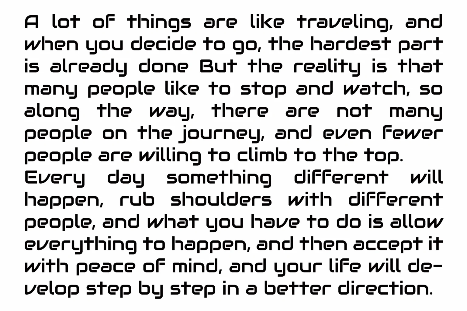 图4的段落排版是对文本适用性的有力验证。在这段关于旅行与人生的哲思文本中,Audiowide展现出了超越“科技字体”刻板印象的细腻一面。均匀舒适的字间距、合理的行高、以及圆润清晰的字形,共同构成了一块灰度平稳、节奏流畅的文本区域。圆润的特征不仅没有降低可读性,反而使阅读过程变得轻松、友好,同时仍散发着冷静、现代的格调。这证明了它不仅能用于UI元素、数据展示和标题,也完全能够胜任网站正文、产品描述、博客文章等需要一定篇幅阅读、且追求清晰与现代感的场景。