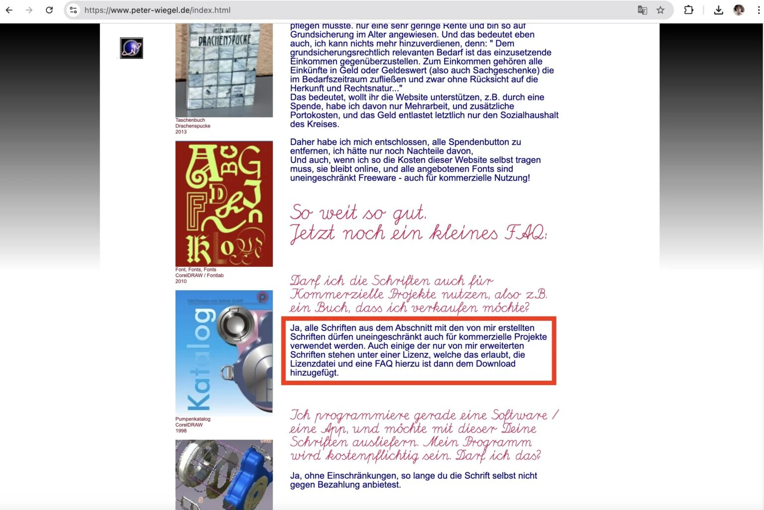 对于字体版权的说明,作者在其官网(见上方截图红框处)的表述,经翻译后内容如下:“是的,我创建的字体部分中的所有字体均可无限制地用于商业项目。我修改过的一些字体也拥有允许此类用途的许可;许可文件和常见问题解答包含在下载包中。”