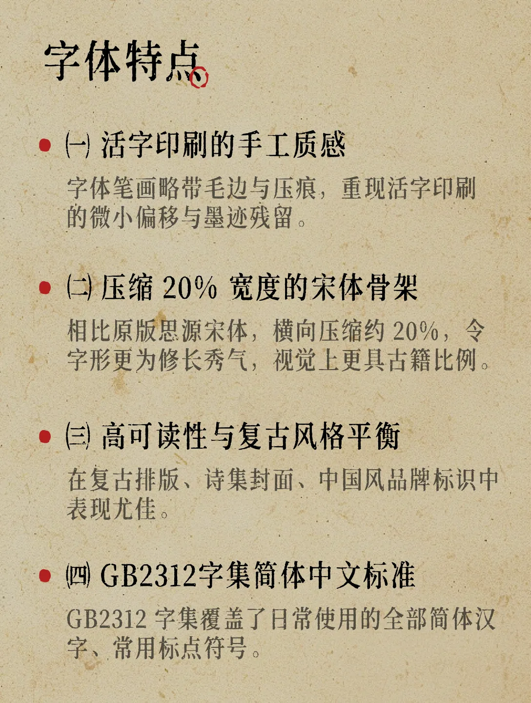 思印宋是一款基于思源宋体母版开发的开源中文字体,严格遵循SIL Open Font License 1.1开源协议。思印宋在保留宋体骨架结构的基础上,通过笔画边缘的毛边与压痕处理,重现了传统活字印刷的墨迹质感与手工韵味。字形采用横向压缩约20%的修长比例,使整体视觉效果更接近古籍排版的比例特征,兼具秀气的视觉美感与良好的可读性。