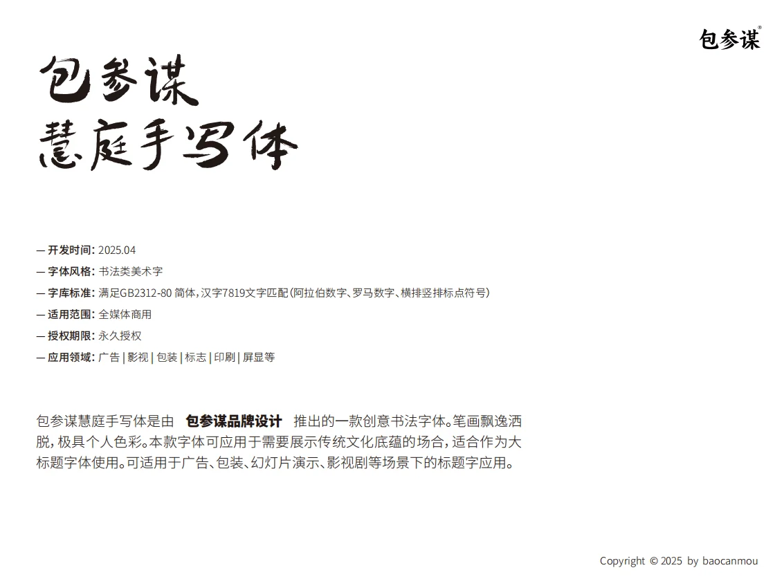 包参谋慧庭手写体是由包参谋品牌设计于2025年4月推出的一款书法艺术免费可商用字体,设计融合了传统毛笔书写的韵律美与现代字库的实用功能。字体笔画借鉴毛笔起落笔的节奏变化,墨色浓淡自然过渡,在洒脱飘逸的运笔中保持字形结构稳定。