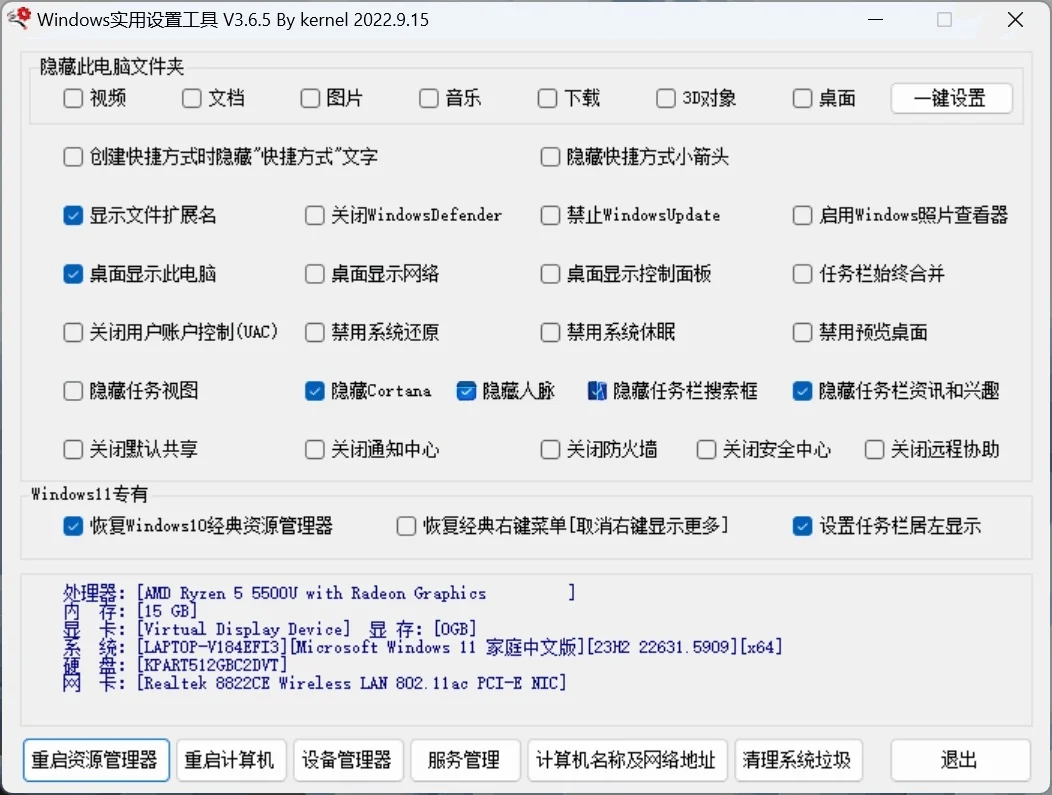 界面管理方面,工具可以隐藏“此电脑”中的默认文件夹,显示经典控制面板,去除任务栏上的“资讯和人脉”等组件,让系统回归简洁。
