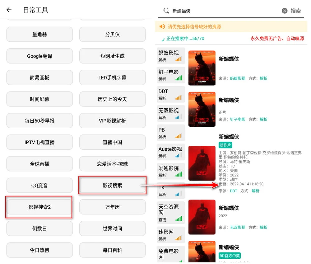 新版本的影视搜索属于会员功能项目(现已解锁,无限使用),增加了更多路线,看起来有点像TV影院的感觉,搜索某个资源之后,会列出所有包含该资源的路线。