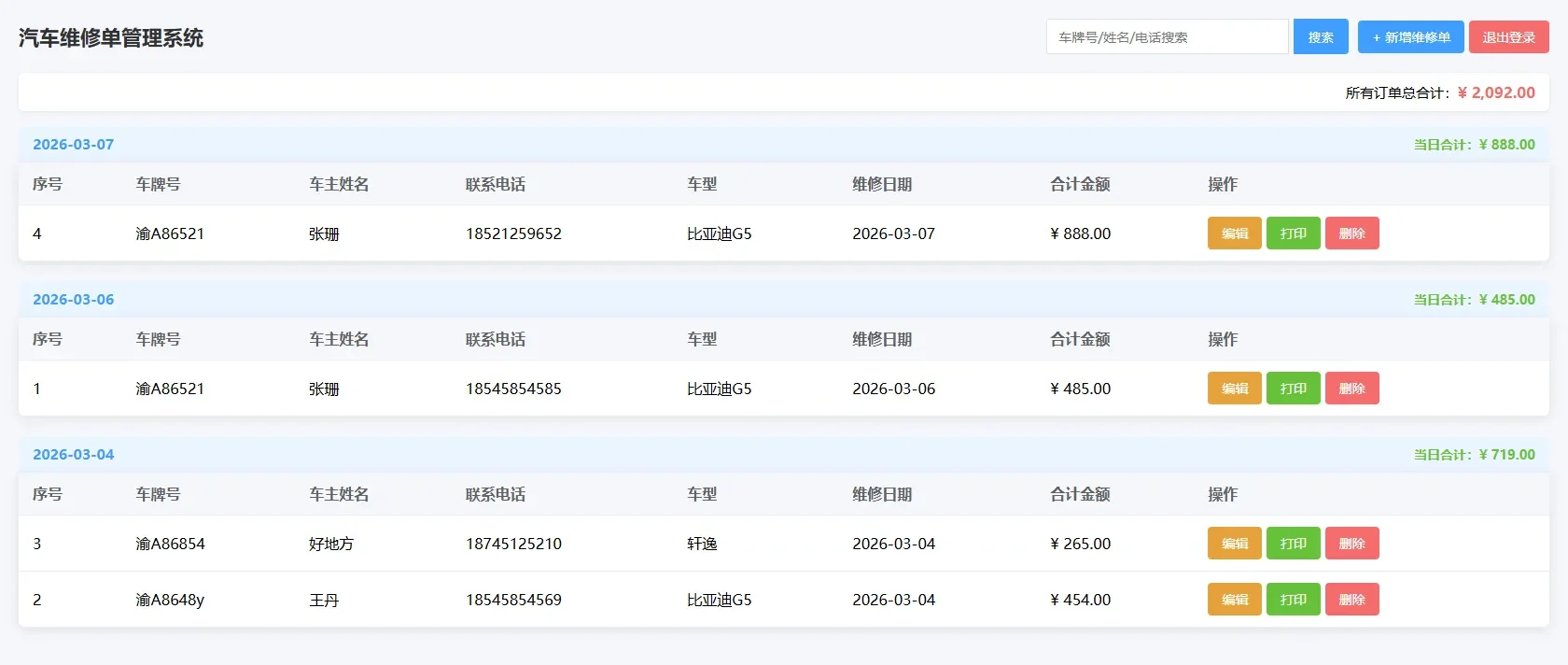 汽修单管理系统,专为中小汽修门店打造的轻量化管理工具。它能帮你高效管理维修订单和客户信息,从车辆信息录入到故障分析、费用统计,全程数字化流转,告别纸质单据和混乱台账。系统界面简洁直观,操作零门槛,同时支持按用户、按日期精准查询,让每一笔维修记录都清晰可追溯,全面提升门店运营效率与客户服务体验。