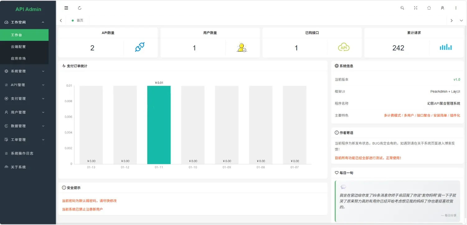 总之,幻影API聚合管理系统是一个功能完善、易于使用、安全可靠的API管理平台,适合各种规模的企业和开发者使用,帮助他们快速构建和扩展应用功能。