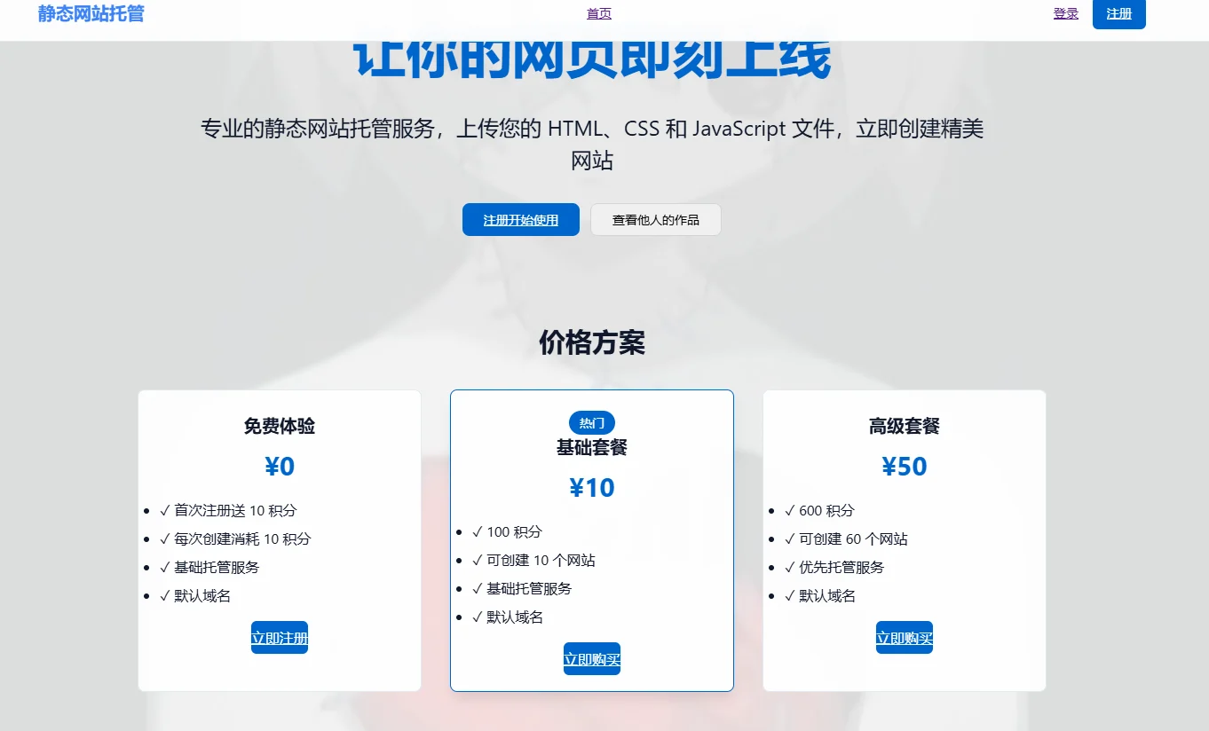 专业的静态网站托管服务,上传您的HTML、CSS 和JavaScript 文件,立即创建精美网站,支持虚拟主机上传即用!