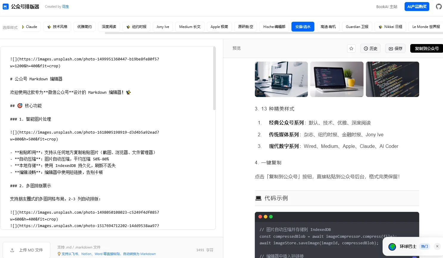 花生公众号排版器源码,专为微信公众号设计的Markdown编辑器,特点是内置了13种风格样式,包括杂志、纽约时报、Jony lve、Apple极简、Medium长文、深度阅读等,看起来美观大气,另外支持图片智能处理、实时预览、一键复制、样式收藏、代码高亮、文件导入等功能。