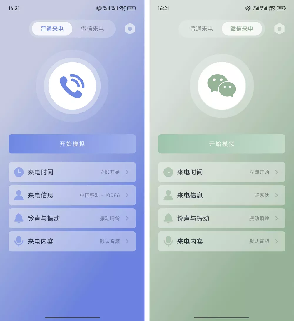 假装来电是一款模拟来电的应用,它简直把 “模拟来电” 玩出了花!除了基础的电话模拟之外,还能伪装微信语音通话。而且无需联网,也无其他不必要的权限。