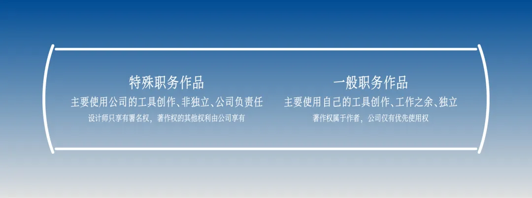 接下来聊聊设计师或者创意人员和公司之间的著作权问题,毕竟大部分人都是在职场、给别人打工,难免会遇到一些作品版权的问题。第一个要聊的就是作品版权的归属问题。根据《著作权法》第十八条规定,主要是利用公司的物质技术等条件创作的职务作品,且公司承担责任,则设计师只享有署名权,著作权的其他权利由公司享有,也就是特殊职务作品。所以说千万不要在离职的时候剪切走文件或者 PSD 合层,不要赌气,因为真的不合法,千万不要相信 xhs 上的爽文。