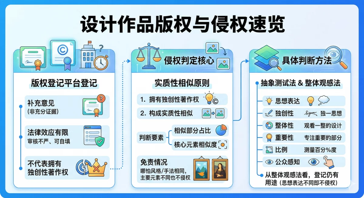 也就是说如果你俩哪怕使用的是同一个风格或者同一个设计语言或者同一个设计手法,只要主要元素不一样,或者没有完全一模一样的元素,就很难构成侵权。具体如何去判断,一般使用的是抽象测试法和整体观感法,从思想表达、独创性、整体性、重要性、比例和公众感知六个角度去判断,也就是说除了设计元素一模一样,还有一定的感性判断区间。所以再回到上一段的版权登记,从整体观感法来看的话登记是有一定用处的,因为思想表达如果在登记时不一样,哪怕最终呈现却类似,也不会构成侵权。