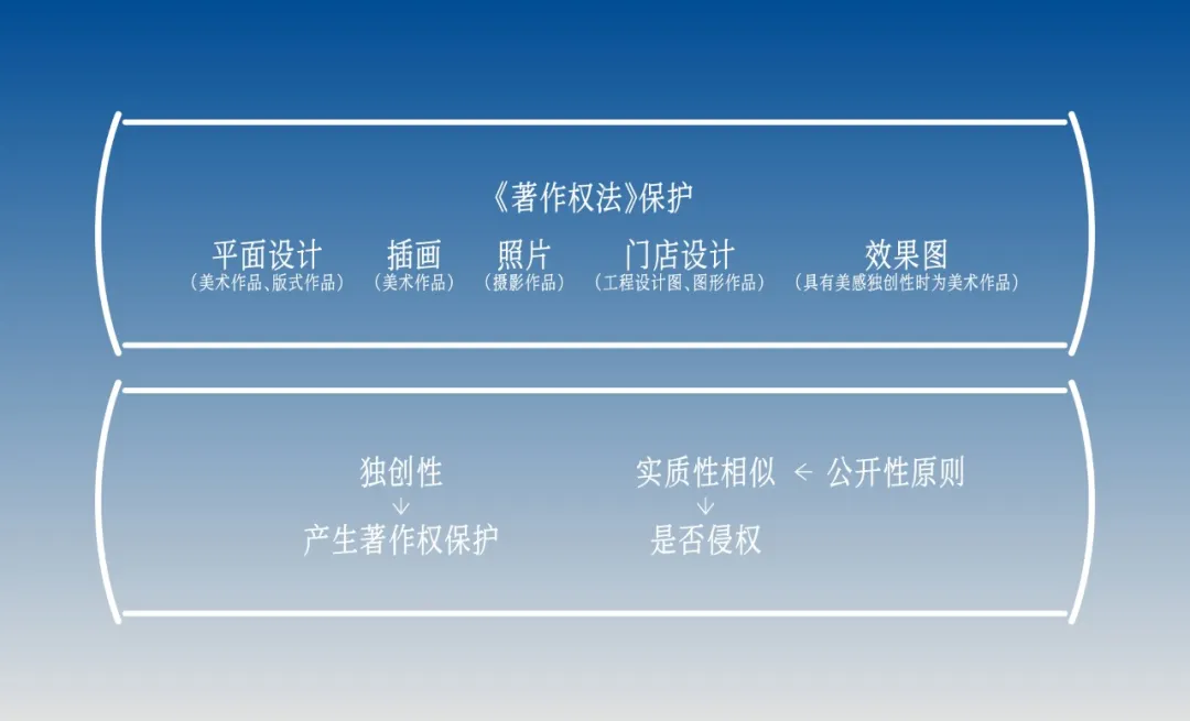 著作权保护这件事就和上面那个黄小厨的案例有关了,为什么作为提出创意的 A&A 输了,从判决书来看,问题就在于整个活动场地的设计主要使用的黄小厨的Logo和美术字,其他设计并没有独创性的部分,简单来说就是你如果只用了品牌方的 VI 但没有自己的创意的话,就没有独创性的著作权,也就无所谓侵不侵权。这里就涉及到著作权里室内设计的一些解释,在版权保护中,只有有独创性的设计、不能被仿造与复制,才真正拥有能打官司的著作权,也就是说只保护独创不保护行活。
