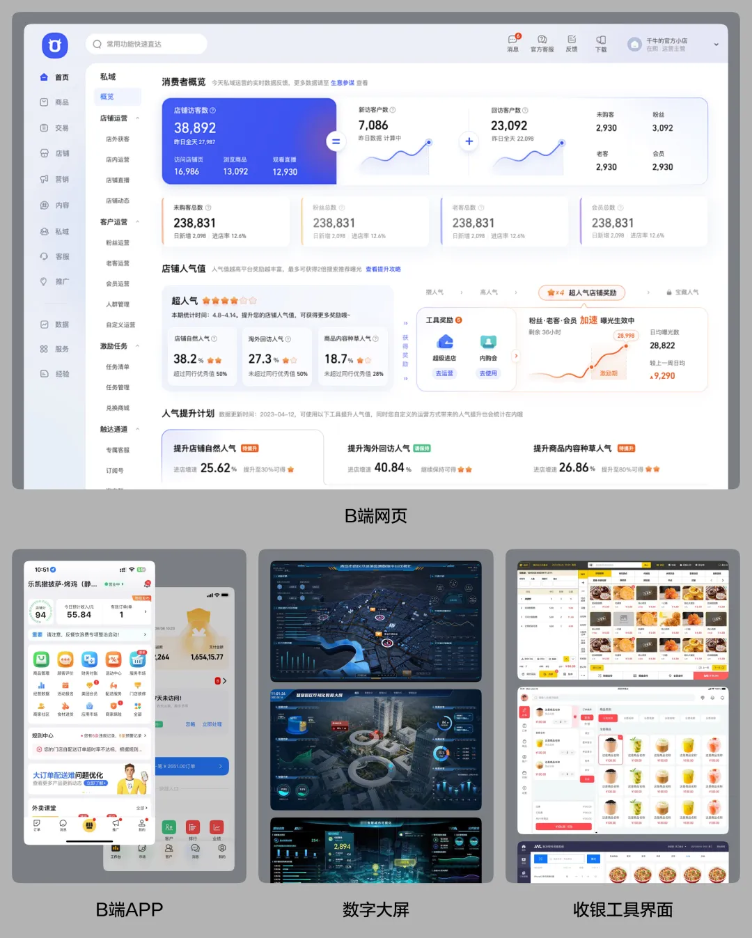 B 端主要负责的是面向商业用户/打工人的产品界面设计,以 PC 端网页管理系统为主,但也会包含移动端产品设计、数字大屏设计、商用定制产品界面设计等。