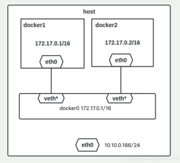 如一般Docker会使用172.17.0.0/16这个网段,并将172.17.0.1/16分配给docker0网桥(在主机上使用ifconfig命令是可以看到docker0的,可以认为它是网桥的管理接口,在宿主机上作为一块虚拟网卡使用)。单机环境下的网络拓扑如下,主机地址为10.10.0.186/24。
