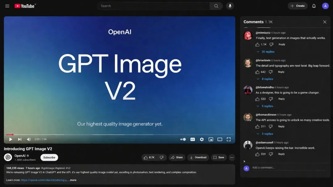 Generate an image: A realistic YouTube screenshot showing the official launch promotional video for GPT Image V2 from OpenAI's official account, with comments, 16:9 aspect ratio, 4K resolution.