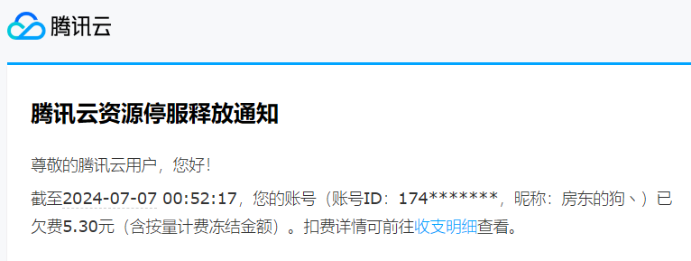 大半夜被腾讯云的告警电话闹醒了,看了一下邮件,账户欠费停服。