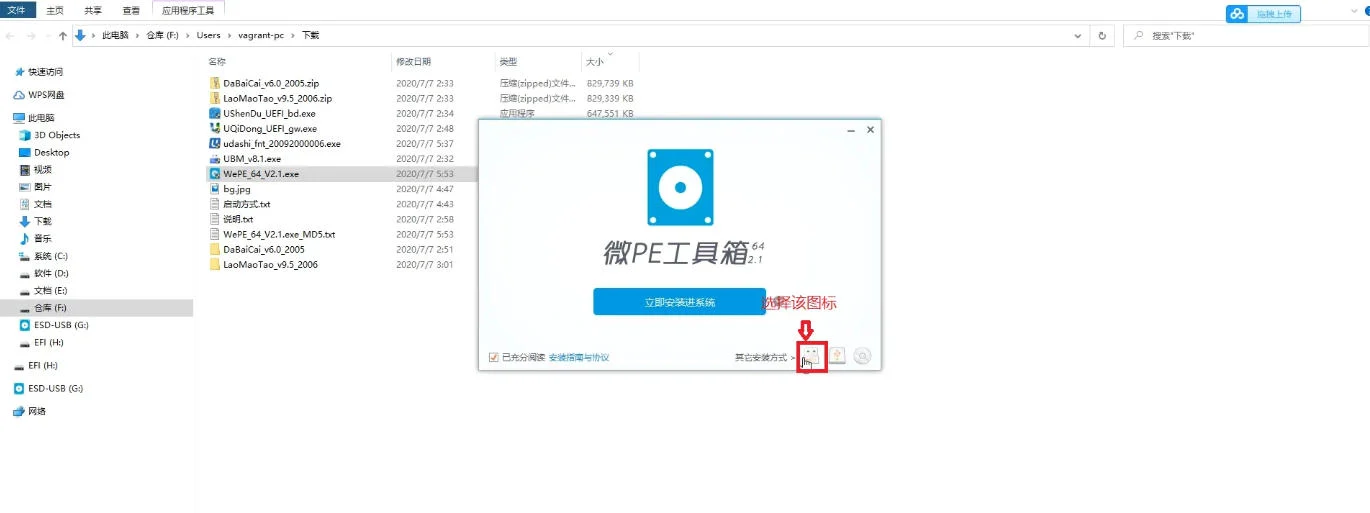 启动后,点击界面右下角的 “安装PE到U盘” 按钮(或类似选项)。