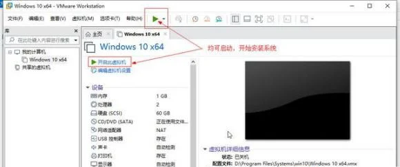 3.会自动回到下图所示的启动虚拟机界面,点导航上的那个绿色图标或“开启此虚拟机”均可启动,这个随便你点哪个都可以,下图箭头所示: