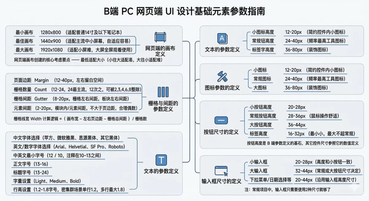 前面分享了 C 端移动端的 UI 设计的相关参数,在今天我们就要分享 B 端 PC 网页端为主的参数了,同样我们也会分为两篇,包括基础元素参数与常用组件参数定义。