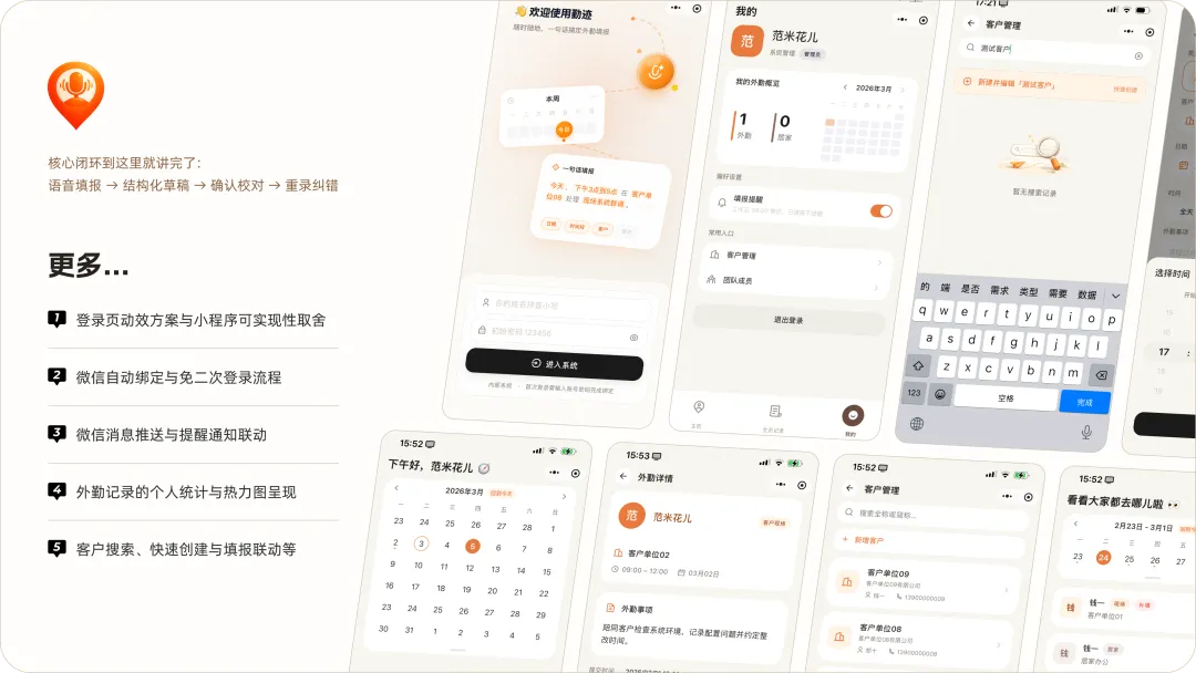 最近我用AI 编程 ,独自为公司内部从0到1做了一个小程序 ,主要用来解决一件事:员工外勤填报 。 核心能力是「语音一句话」快速生成外勤记录,同时也支持手工填报、全员记录查看、客户与成员管理、考勤填报定时提醒推送等。