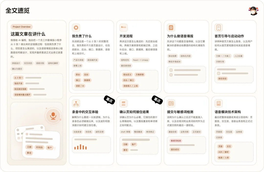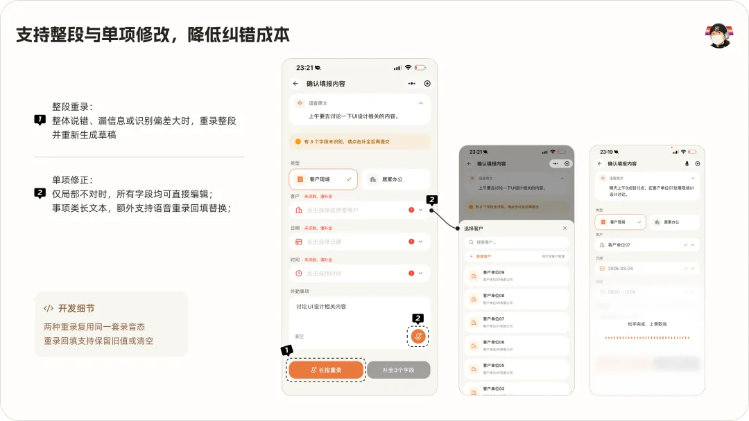 - 确认页: 让用户在提交前重录整段语音或逐项修正