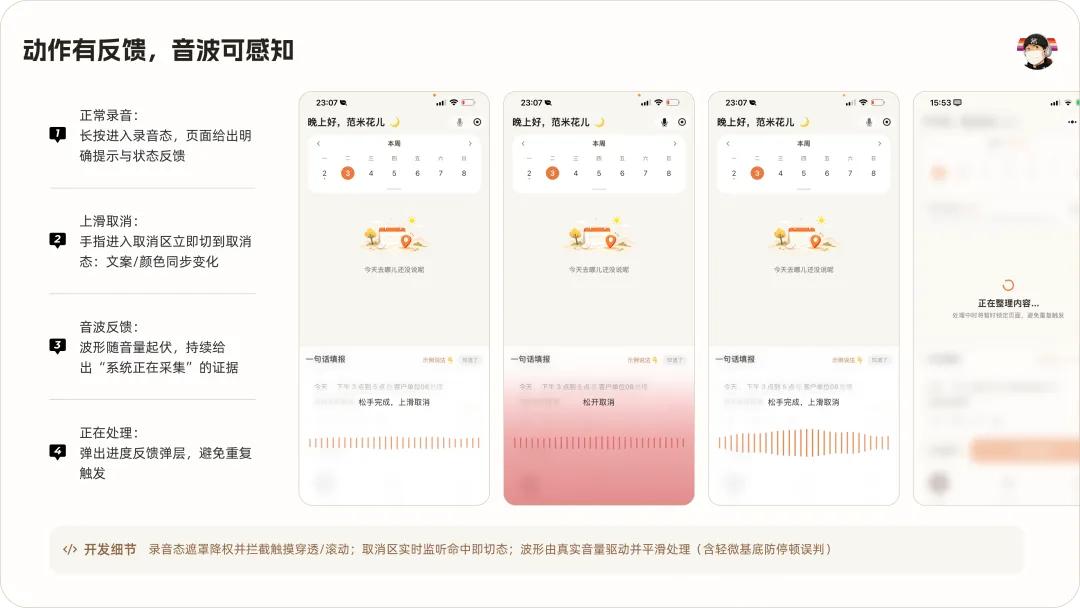 这三类反馈分别解决三个风险: 不确定是否录上了|不确定松手会怎样|不确定系统有没有听到 。
