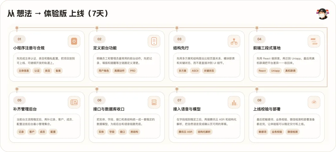 包括小程序注册与配置、产品与体验规划、前端页面开发、后台管理端搭建、接口与数据库实现、腾讯云语音识别与大模型结构化解析接入,以及微信体验版上线前检测、部署与真机联调等全流程落地。