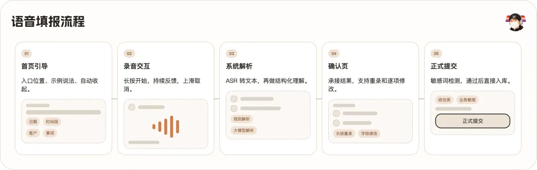 如果把这套语音填报当成一个完整模块来看,它可以拆成五个连续阶段,分别承担 “引导、输入、理解、修正、校验“职责