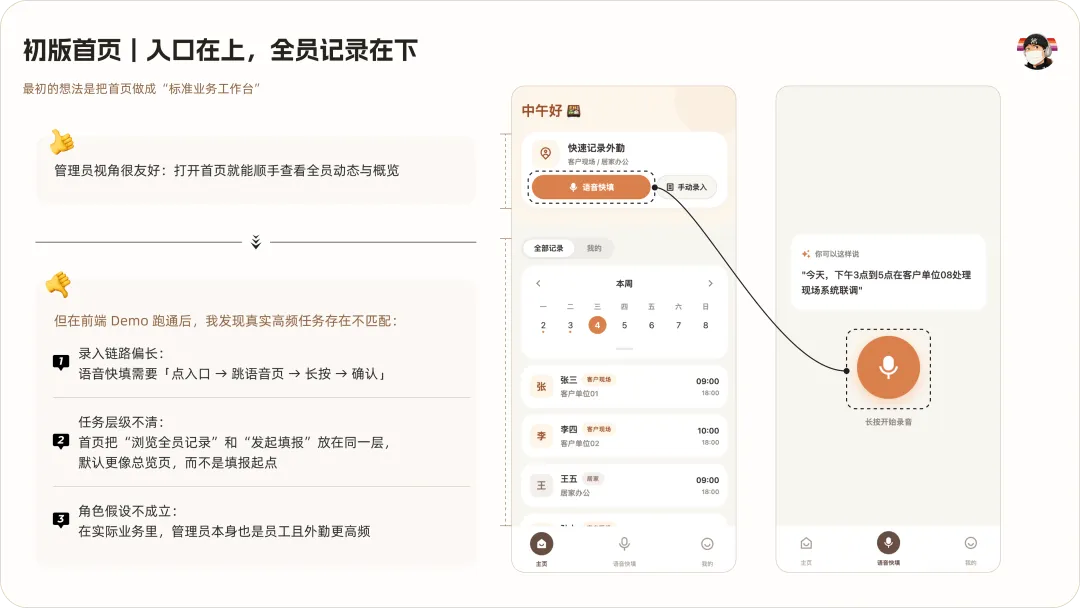 同时,根据公司实际情况,管理员本身也是员工且外勤频率更高。所以, 无论哪个角色,进入前台后的第一目标其实非常明确,就是先完成自己的填报。尤其是基于语音能力,首页的最高频任务进一步向“快速发起填报”集中。