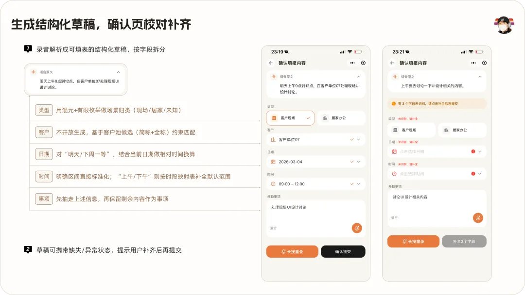 - 草稿可以带缺失/异常状态(比如缺客户、缺时间段、事项为空),确认页据此提示用户补齐后再提交。