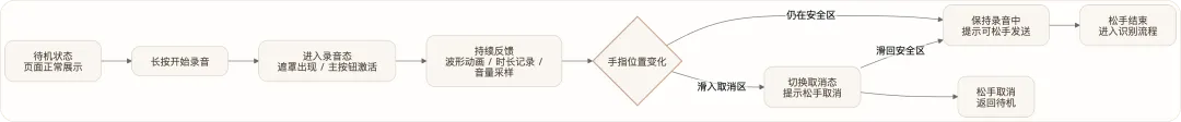 把录音过程做成明确的状态机:录音态 / 取消态 / 结束态,首页和确认页完全复用同一套状态语言。