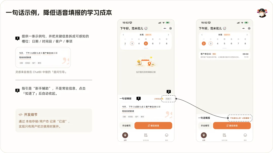它直接给用户一个可以模仿的示例句,并把这句话里隐含的结构拆成更容易理解的 槽位信息 ,比如日期、时间段、客户和事项。