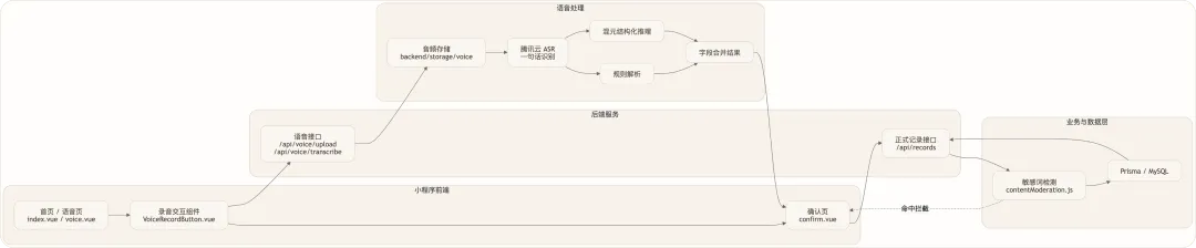 如果从模块职责上看,这套语音填报大致分成四层:页面层、交互层、语音业务层和正式记录层。